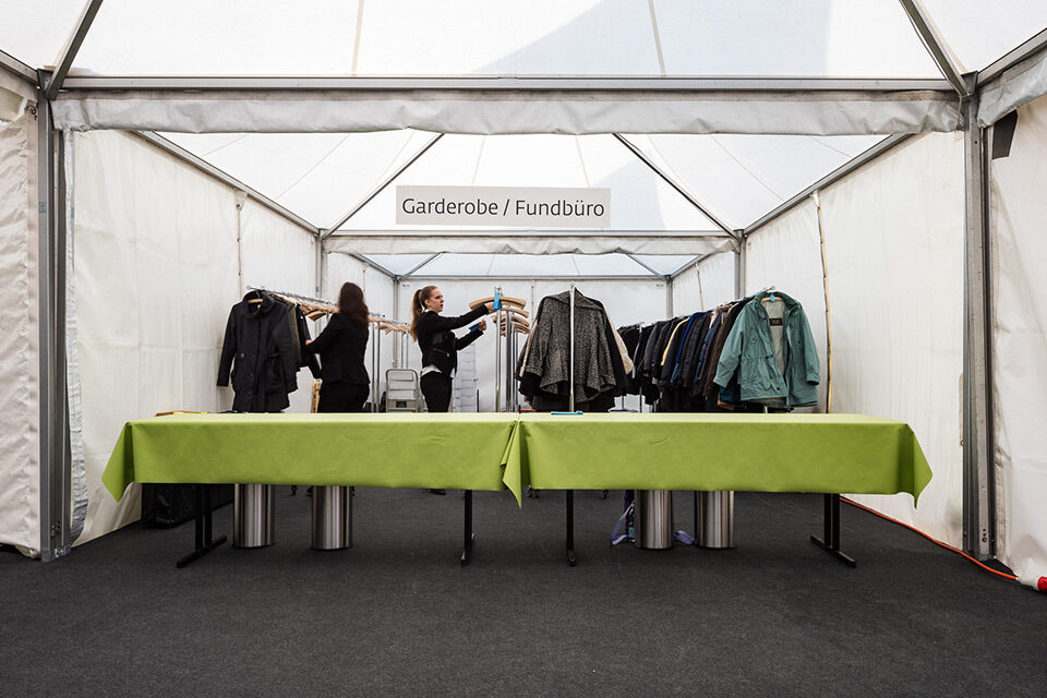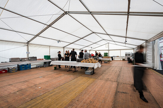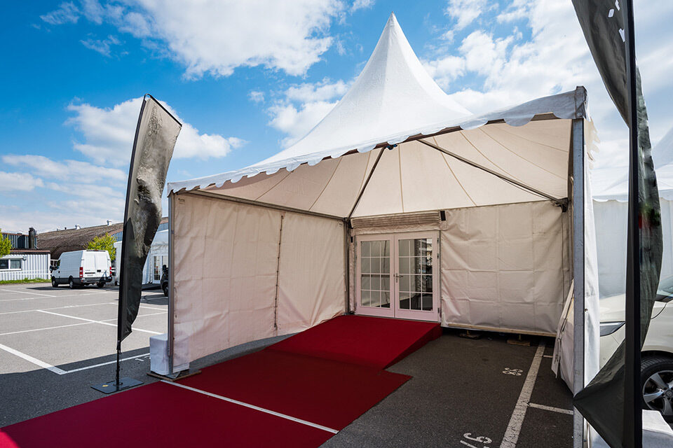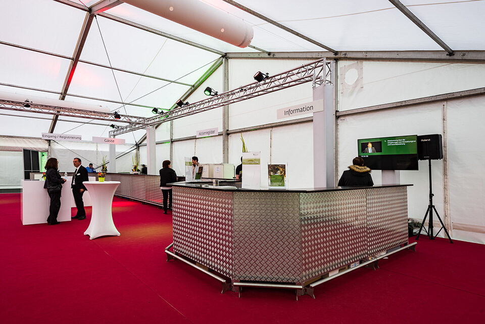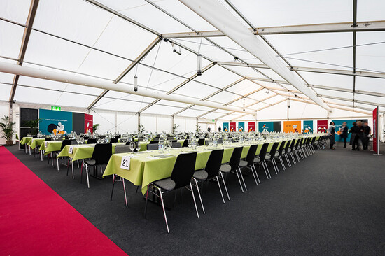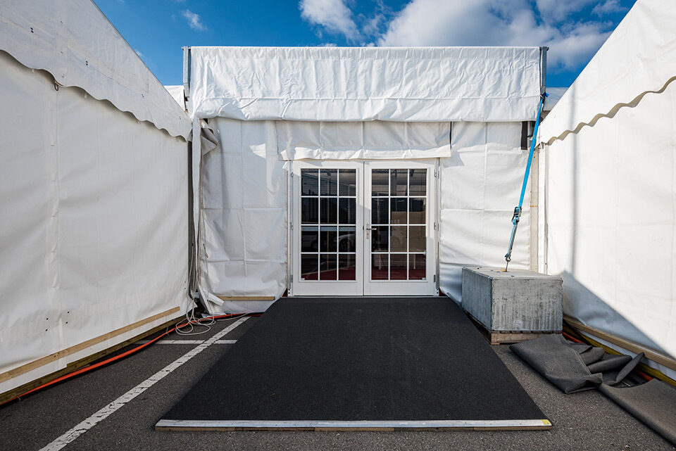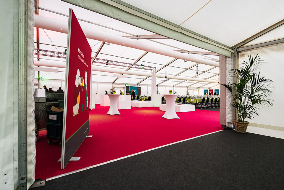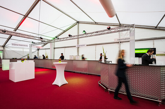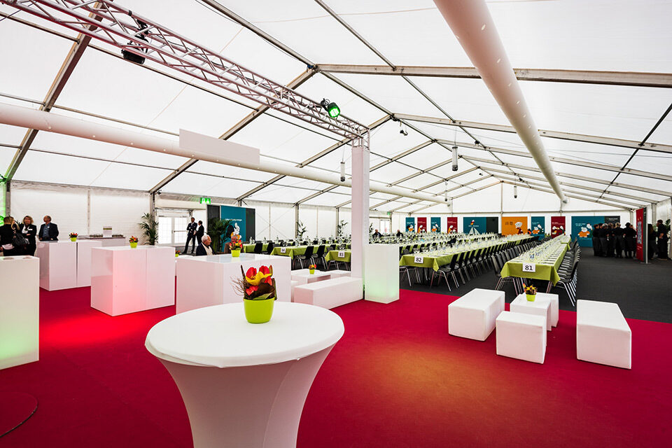 Für diesen Event kam ein breites Sortiment an Zelten und Mietmobiliar zur Anwendung wie Tische, Stühle, Böden, Teppich, Barelemente, Türen, Rampen etc. Die Übergänge zwischen mobiler und bestehender Infrastruktur erforderten zudem eine minutiöse Planung und präzise Montagearbeit.