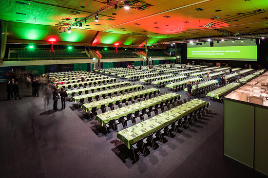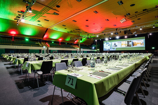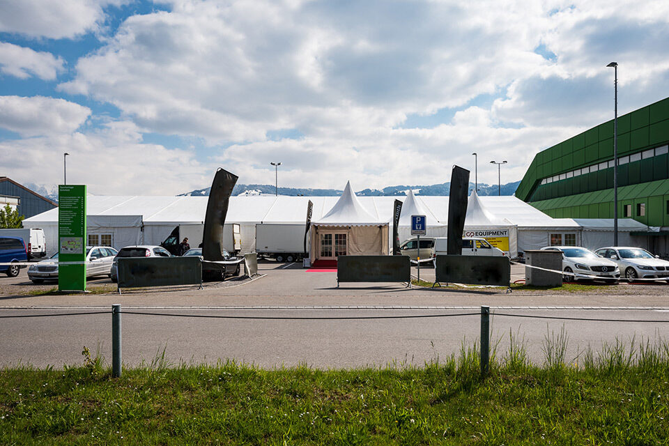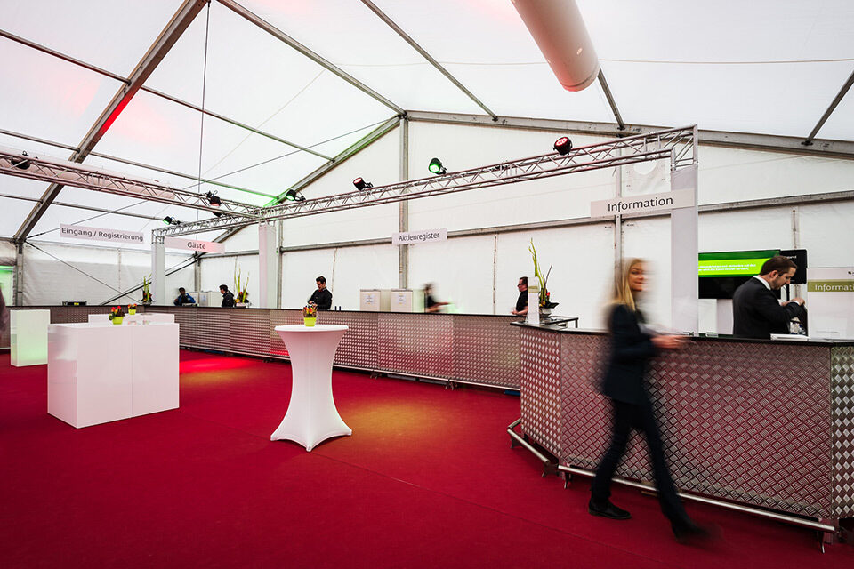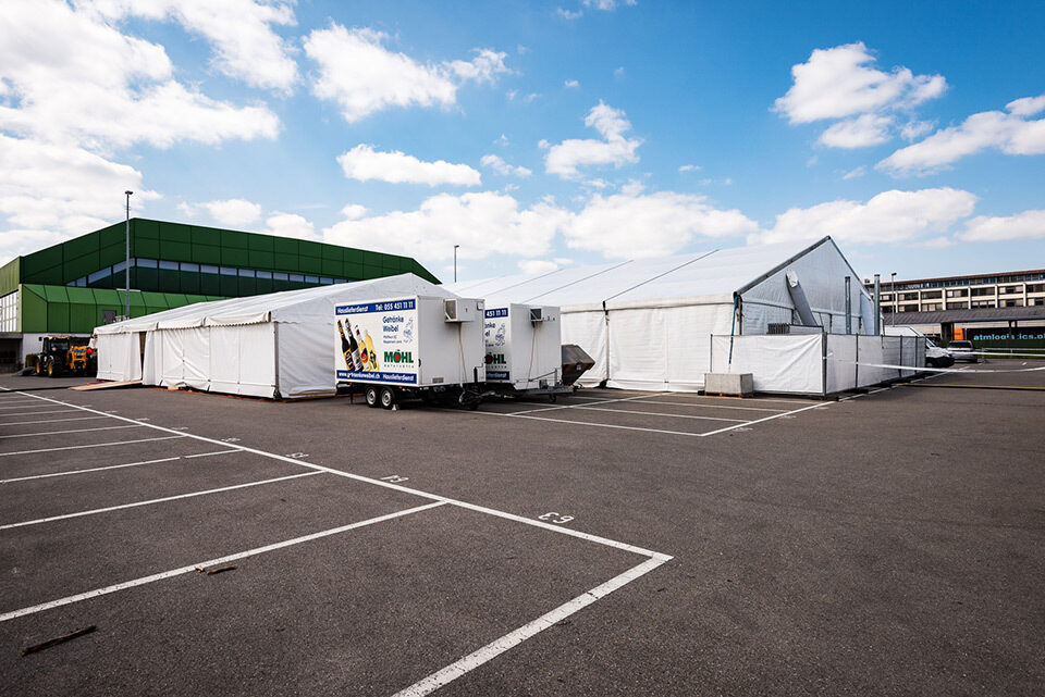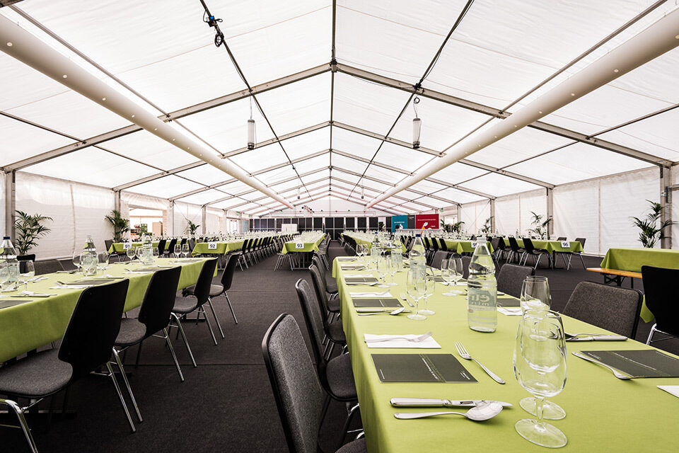 Für die Generalversammlung und das anschliessende Aktionärsfest einer erfolgreichen Regionalbank erstellte Lenzlinger Zeltvermietung die Zeltinfrastruktur inklusive Anschluss an die benachbarte Sporthalle, die für den offiziellen Teil ebenfalls mit Saaltischen und Stühlen von Lenzlinger Söhne eingerichtet wurde. Zur Veranstaltung wurden rund 1'200 Aktionäre erwartet.